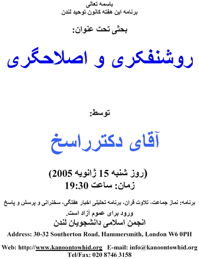 'جلسه بحث پيرامون "روشنفکري و اصلاح گري"، کانون توحيد لندن، 15 ژانويه'