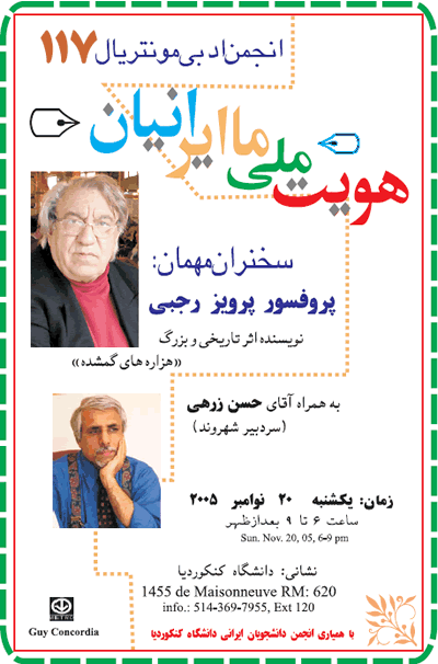 هويت ملی ما ايرانيان، سخنرانی پروفسور پرويز رجبی به همراه حسن زرهی، يکشنبه ۲۰ نوامبر در مونترال