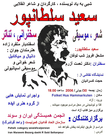 'شبی با ياد نويسنده، کارگردان و شاعر انقلابی سعيد سلطانپور در شهر گوتبرگ سوئد، ۳۰ يونی'