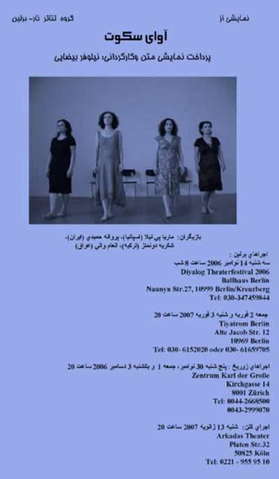 'برنامه اجرای نمايش "آوای سکوت" در شهرهای برلين، زوريخ و کلن، کاری از نيلوفر بيضايی'