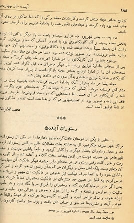 مجله يغما هر ماه پيش از آن که به اداره توزيع فرستاده شود به وسيله پست برای مشترکان فرستاده می‌شد. کسانی که مشترک بوده‌اند اگر به مجله‌های خود بنگرند، اين نامه و کاريکاتور در آن هست. اما نسخه‌هايی که در دست‌فروشی‌ها به فروش می‌رفت فاقد اين نامه و تصوير بود..."