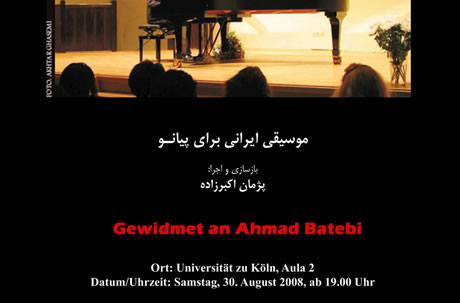 شنبه شب، ۳۰ آگوست، رسيتال موسيقی ايرانی برای پيانو، با تنظيم و اجرای پژمان اکبرزاده در دانشگاه کُلن برگزار میشود.