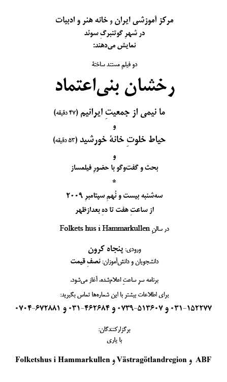 نمايش دو فيلم مستند ساخته رخشان بنی اعتماد، با حضور فيلمساز، در شهر گوتنبرگ سوئد، سه شنبه ۲۹ سپتامبر