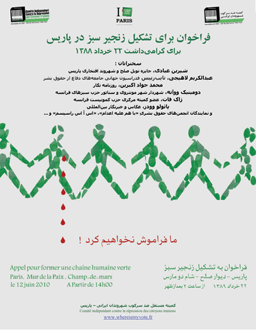 » 'دارندگان گرین کارت هم مشمول ممنوعیت سفر به آمریکا میشوند' » فرهادی بزودی تصمیماش را برای حضور در مراسم اسکار اعلام میکند » گیتار و آواز گلشیفته فراهانی همراه با رقص بهروز وثوقی » چگونگی انفجار ساختمان پلاسکو را بهتر بشناسیم » گزارشهایی از "دیپورت" مسافران ایرانی در فرودگاههای آمریکا پس از دستور ترامپ » مشاور رفسنجانی: عکس هاشمی را دستکاری کردهاند » تصویری: مانکن های پلاسکو! » تصویری: سرمای 35 درجه زیر صفر در مسکو! پاريس: فراخوان به تظاهرات بزرگ زنجير سبز انسانی برای گراميداشت ۲۲ خرداد ۱۳۸۸، با حضور شيرين عبادی و عبدالکريم لاهيجی، ۱۲ ژوئنسخنرانان: و سرانجام بيست و دوم خرداد ۸۹ رسيد، يک سال گذشت و سالها پير شديم. شنبه ۱۲ ژوئن ۲۰۱۰، ساعت ۲ بعدازظهر