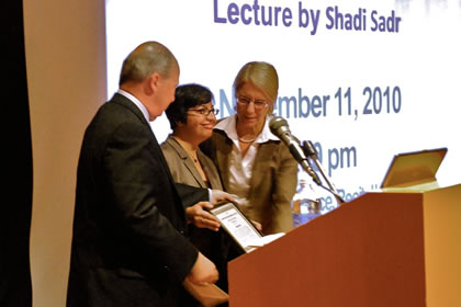 عصر روز گذشته، طی مراسمی با حضور اساتيد دانشکده حقوق دانشگاه سانتاکلارا، دانشجويان اين دانشگاه و فعالان جامعه مدنی ايرانی، جايزه سال ۲۰۱۰ اين دانشگاه به شادی صدر، وکيل حقوق بشری و فعال جنبش زنان اعطا شد. وی در ابتدای سخنرانی خود، افتخار جايزه دانشگاه سانتاکلارا را به نازنين خسروانی، روزنامه نگار شجاع و فعال حقوق مدنی و نسرين ستوده، وکيل حقوق بشری پيشرو تقديم کرد. شادی صدر ضمن اينکه از حضار درخواست يک دقيقه سکوت با آرزوی آزادی و امنيت برای اين دو زن فعال که هر دو تحت شديد ترين فشارها و محروم از ابتدايی ترين حقوق خود در زندان هستند کرد، سخنرانی خود را که گوشه هايی از آن در زير آمده است ايراد کرد. وی در بخشی از سخنرانی خود، با اشاره به سه پرونده تجاوز در زندان در دهه ۶۰، ۷۰ و پس از انتخابات و سرنوشت سه زندانی زن، نيلوفر تشيد، زهرا کاظمی و ترانه موسوی، گفت: "از نظر تاريخی، ترانه موسوی تداوم زهرا کاظمی است و زهرا کاظمی، تداوم نيلوفر تشيد. اما ما در ايران با تجارب تاريخی منقطع روبه رو هستيم. با بيش از يک قرن مبارزه برای دموکراسی و آزادی، هنوز از خيلی جهات در نقطه صفر قرار داريم. سال گذشته، ما ديديم که حکومت چگونه به بسياری از کسانی که مثل خود ما در اعتراضات مسالمت آميز پس از انتخابات شرکت داشتند، غير منصفانه و ناعادلانه، اتهام محاربه که معنايش، اقدام مسلحانه عليه حکومت و مجازاتش مرگ است، وارد کرد، اما نتوانستيم بين اين شکل سيستماتيک قلب واقعيتها در نظام قضايی ايران و آنچه در گذشته اتفاق افتاده، ارتباطی برقرار کنيم. ما نتوانستيم اين موضوع را درک کنيم که اگر تجاوز و شکنجه جنسی در زندانها پس از انتخابات اتفاق افتاد، اين صرفا اتفاقی تازه و بی سابقه نبود، بلکه اتفاقی بود که چون روايت نشده بود، چون حقيقت در مورد آن روشن نشده بود و چون عدالت در مورد عاملان و آمران آن برقرار نشده بود، باز هم تکرار شد.