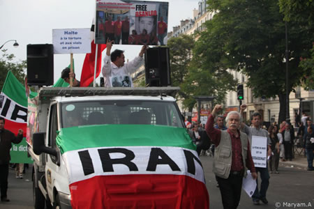 کميته مستقل ضد سرکوب که مسئوليت تدارک تظاهرات را به عهده گرفته بود، با توجه به فضای عمومی جنبش، مناسبت روز جهانی کارگر، تاکيدات در فراخوان سراسری و گفتگوهای محلی در پاريس، در تهيه باندرولها و پلاکاردها به مطالبات کارگران و انعکاس مبارزات کارگری در ايران بيشترين توجه را نشان داد. يکی از باندرول های اصلی که شعار «زنده باد همبستگی جهانی با مبارزات کارگران ايران» به زبان فرانسه بر آن نقش بسته بود، صحنه هايی از مبارزات کارگران در ايران را نشان می داد. در اين صحنه ها شعارهای کارگران بر روی باندرول های مختلف به چشم می خورد و مطالبات آنها را يادآوری می کرد. در پلاکاردها هم تلاش شده بود همين امر رعايت شود. در حقيقت، پلاکاردها هم صحنه هايی از مبارزه کارگران بود که ترجمه شعارهايی که در اين تصويرها ديده می شد مثل «تشکلهای مستقل کارگری ايجاد بايد گردد» و يا «سنديکا حق مسلم ماست» و يا « بيکاری مساوی با فقر و گرسنگی است» و... به زبان فرانسه در پايين پلاکارد آمده بود.