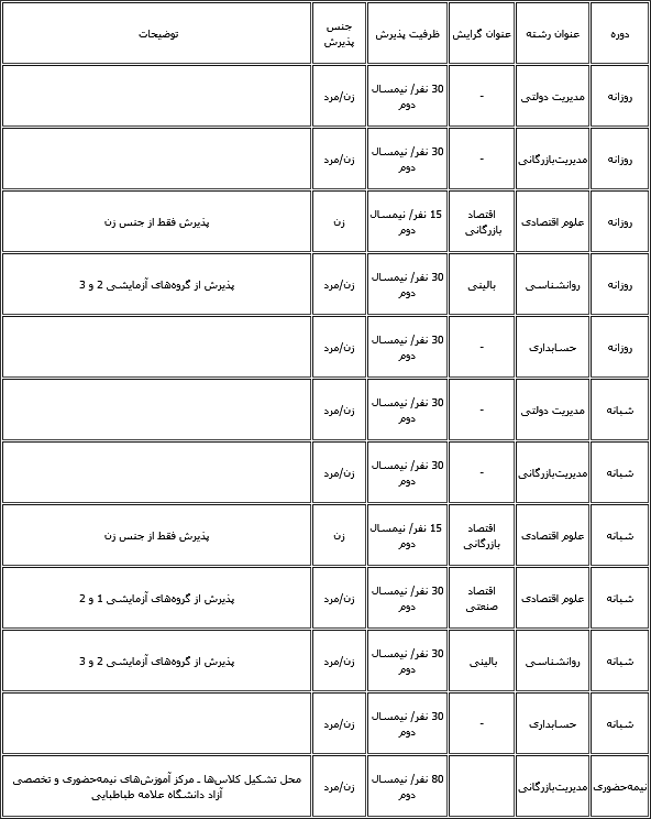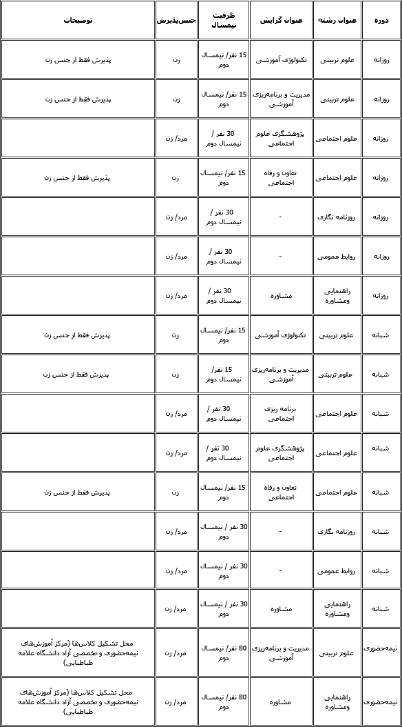 » 'دارندگان گرین کارت هم مشمول ممنوعیت سفر به آمریکا میشوند' » فرهادی بزودی تصمیماش را برای حضور در مراسم اسکار اعلام میکند » گیتار و آواز گلشیفته فراهانی همراه با رقص بهروز وثوقی » چگونگی انفجار ساختمان پلاسکو را بهتر بشناسیم » گزارشهایی از "دیپورت" مسافران ایرانی در فرودگاههای آمریکا پس از دستور ترامپ » مشاور رفسنجانی: عکس هاشمی را دستکاری کردهاند » تصویری: مانکن های پلاسکو! » تصویری: سرمای 35 درجه زیر صفر در مسکو! جدول رشتههايی که به دانشگاه علامه طباطبايی بازگشتند، مهرسازمان سنجش آموزش کشور اصلاحات دفترچه راهنمای انتخاب رشته و همچنين ظرفيتهای جديد رشتههای تحصيلی دانشگاه علامه طباطبايی را اعلام کرد بر اساس اين اصلاح ۳۳ کد رشته به رشته های دانشگاه علامه اضافه شد. به گزارش خبرنگار مهر، اين کد رشته ها در سه گروه آزمايشی علوم انسانی، گروه آزمايشی زبان های خارجی و بخش چند گروهی به ظرفيتهای دانشگاه علامه طباطبايی اضافه شد. رشته های تحصيلی در گروه علوم انسانی